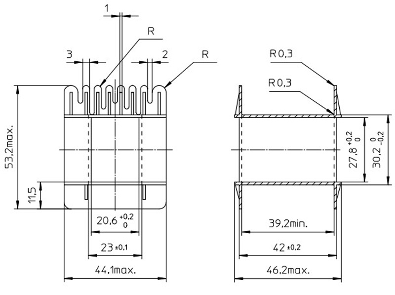 16-pin bobbin with a 23mm x 30.6mm rectangular winding former. Length of the winding former is 39.66mm. Maximum depth of the winding is 8.2mm.
